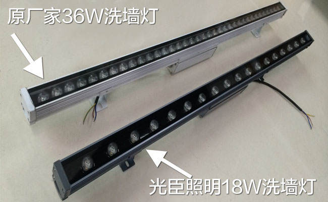 所有的替換產品,LED洗墻燈廠家光臣照明均要求客戶寄來原產品進行檢測和技術參數分析,該產品是市面上的公模產品,與光臣照明的一些公模產品相比無論從款式和尺寸都是一樣的,所以說原廠家用料還是比較注重質量,但是該洗墻燈有一個致命弱點!就是功率和外殼尺寸相差甚遠,導致燈具熱散慢、光衰快和損壞率高。