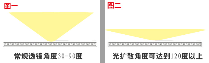 我們用兩張圖讓大家看個明白,LED線條燈為什么要選用光擴散透鏡。如上圖,圖一比喻成我們常規的LED線條燈透鏡的發光模式,圖二比喻成我們加蓋了光擴散透鏡的發光模式,從兩張圖片的對比當中我們能清楚的知道,光擴散的作用是把光束往左右兩邊伸展以達到無暗區的亮化效果。